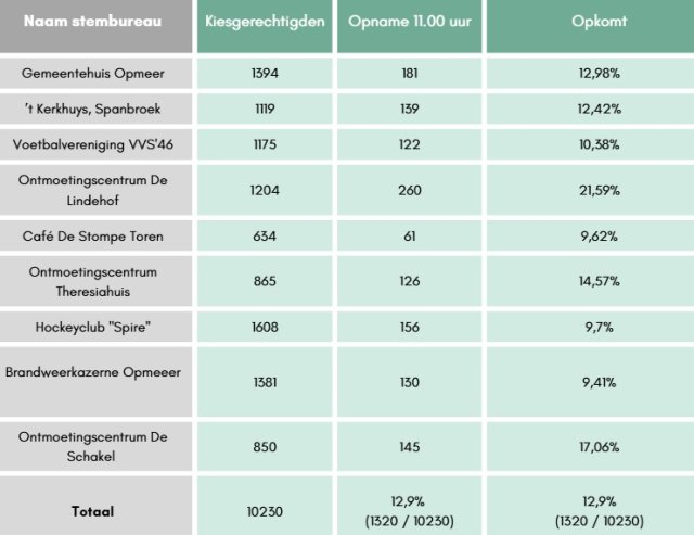 HomeAlle onderwerpenActueelNieuwsTussentijdse opkomt stembureaus om 11.00 uurTussentijdse opkomt stembureaus om 11.00 uur18-03-2026, 13:09 Tot nu toe heeft 12,9% van de 10.230 kiesgerechtigden gestemd. Heb jij al je stem uitgebracht? Kom vandaag nog stemmen. De stembureaus zijn geopend tot 21.00 uur.